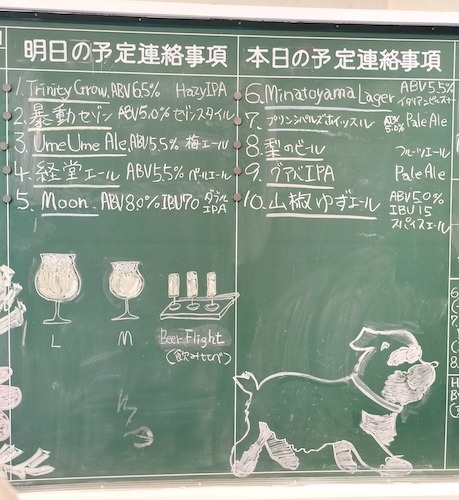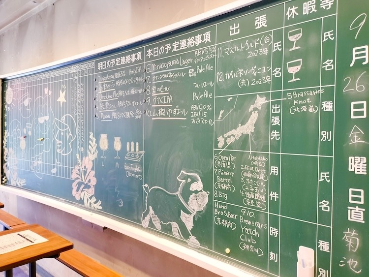 学校らしさ全開の、ノスタルジックな黒板。この日にタップインしているビールやブルワリーの紹介などなど......放課後に描いた落書きのようなものあってすごく懐かしい気持ちになりました!