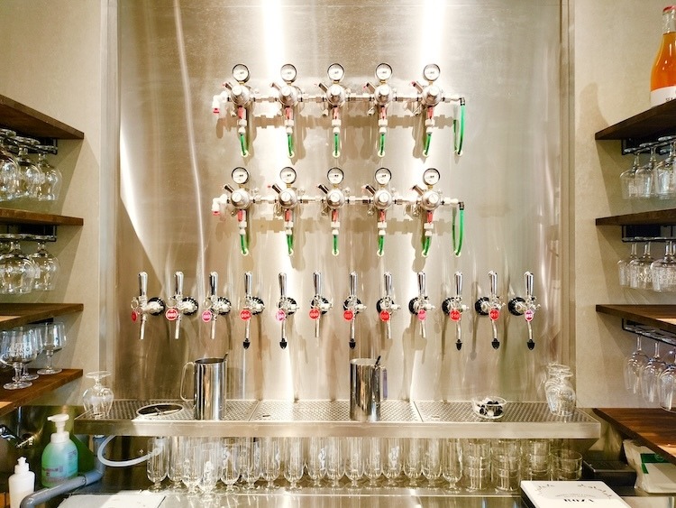 カウンターの向こうには、光り輝く12本のタップ。そのうち10本がビールで、2本は“樽詰めワイン”となっています。ワイン好きの人も誘いやすく、ビールの合間にワインで口直しなんて贅沢な楽しみ方もできそうです。