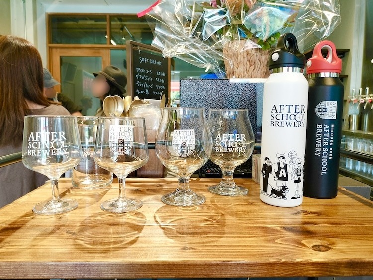 購入可能なオリジナルグッズも見つけました。AFTER SCHOOL BREWERYの校章が映えます。