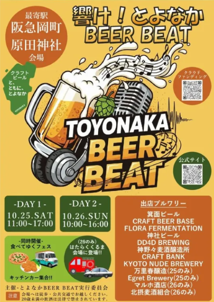大阪・豊中市の原田神社で、クラフトビールフェス 「とよなかBEER BEAT」 が10月25日(土)・26日(日)に開催されます。ビールづくりにゆかりのあるこの街で、「ビールのあるまち・とよなか」を掲げて開かれる初の本格クラフトビアフェスです。