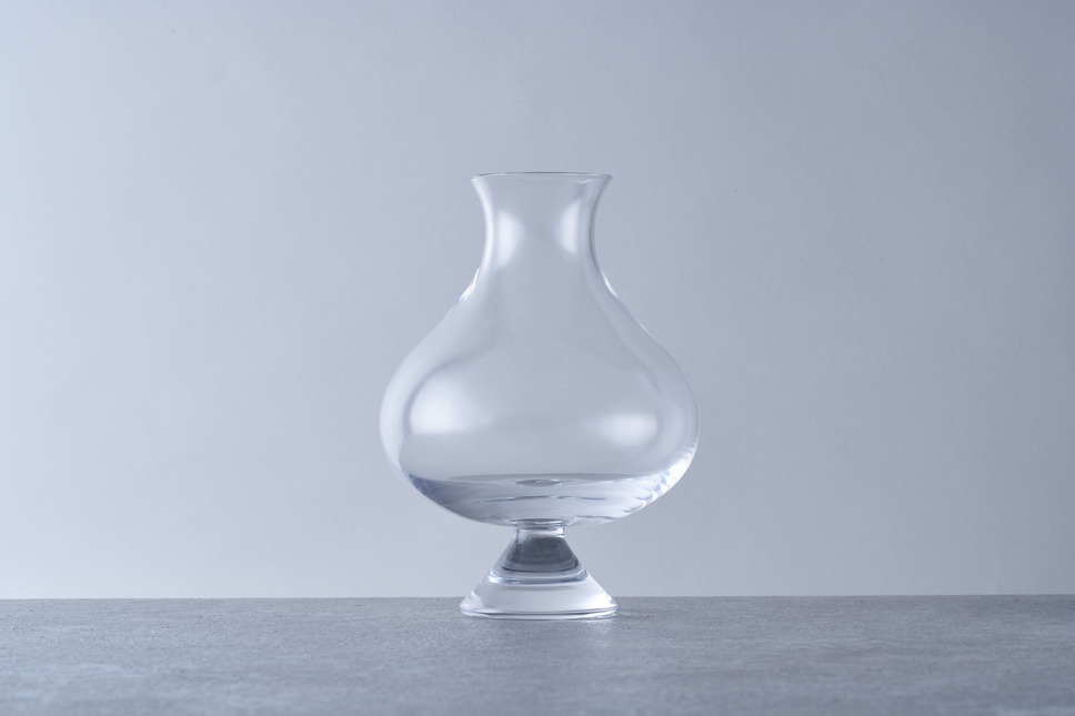 このグラスの特徴である“張り出したボウルと、極端に細く絞られた首元”は、職人の目から見てもひと目で難易度の高い造形だといいます。一般的なコップのようにスムーズには吹けず、型にガラスを流し込み回しながら整える“型吹き”の技法を用いても、担当できる職人が限られる形状です。