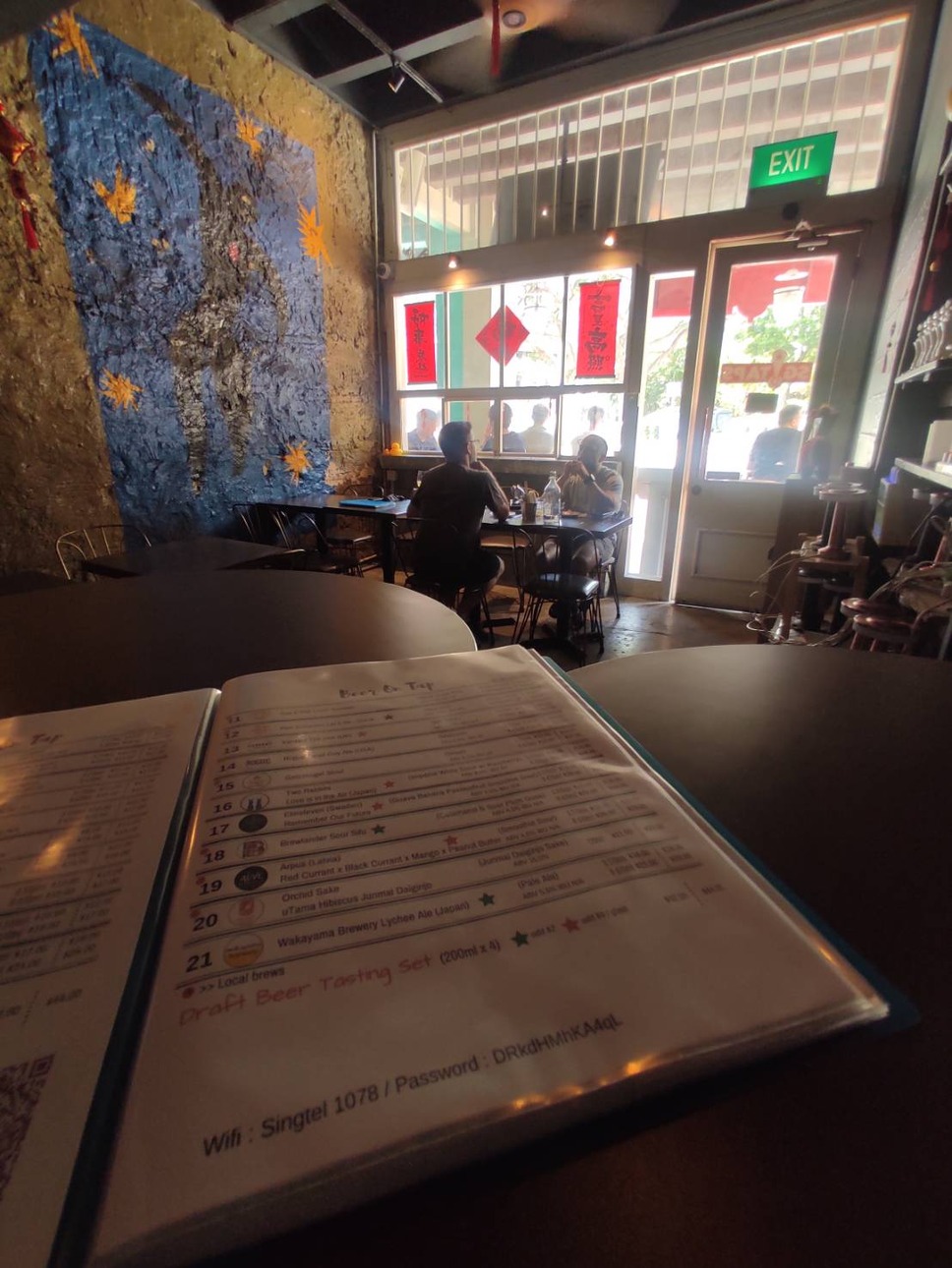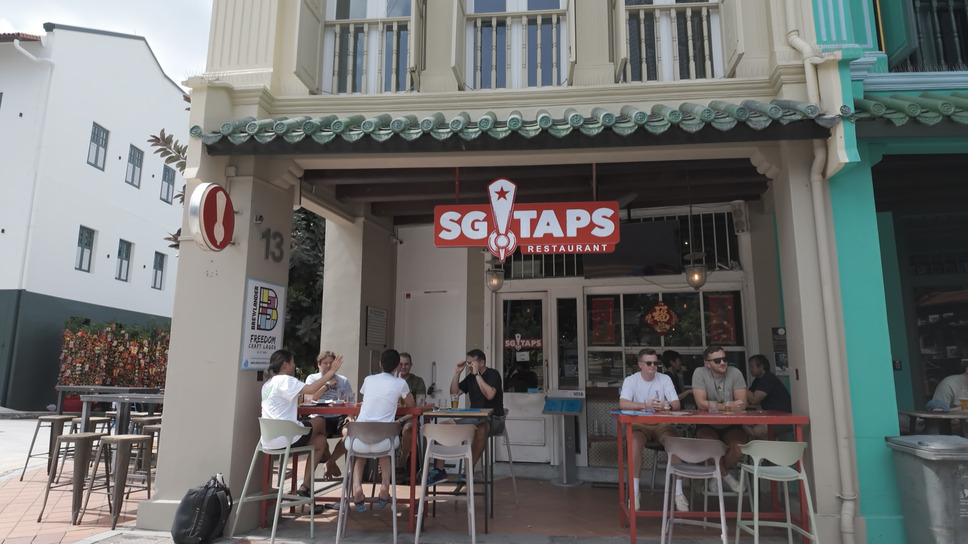 チキンライスが有名なマックスウェルのホーカーセンターで食事を終え、汗を拭きながら5分ほど歩くと「SG Taps」に到着。テラス席はすでに満席。グラスを傾けながら笑い合う声が外までこぼれていました。外の空気も気持ちよさそうだったけれど、今回はどうしても店の方にシンガポールのビールシーンについてお話しを伺いたかったので店内へ。