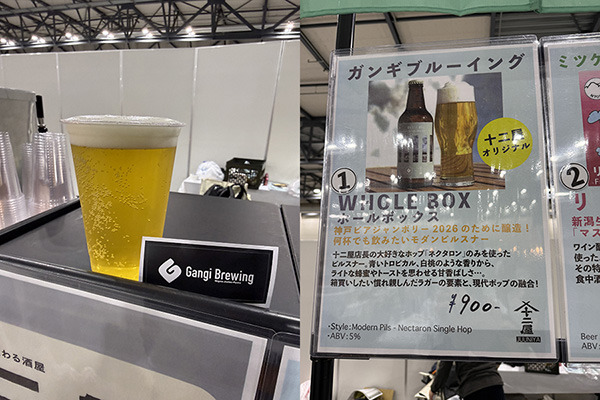 KBJ2026のためにGANGI BREWINGと十二屋がコラボ醸造した、「何杯でも飲みたいモダンピルスナー」がキャッチコピーのビール。十二屋店長が大好きなホップ「ネクタロン」のみを使用し、トロピカルでもあり、白桃のような香りから入り、はちみつトーストのような甘くて香ばしい口当たりが広がる印象のラガーの要素と現代的なホップを融合させたビール。1杯目から良いセレクトのビールでした。