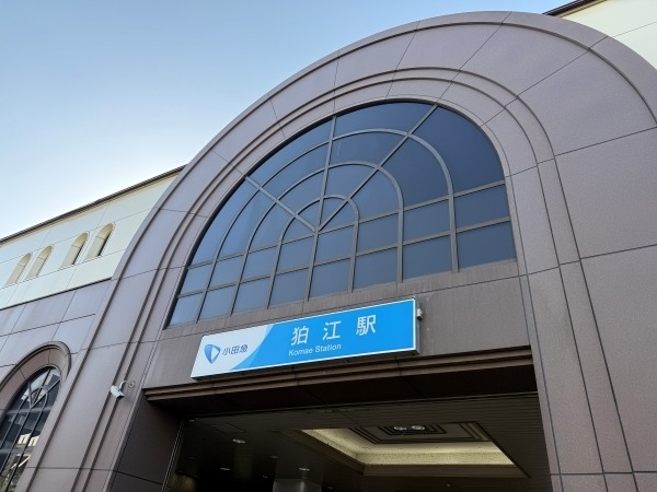 小田急線・狛江駅。各駅停車が止まるこの駅から、南口の住宅街を抜けて歩くこと2分。最初に目に入るのは、白地に縦書きで「狛江湯」と記されたポール看板。近づくにつれ、入口にかけられた白い暖簾が風に揺れる。
