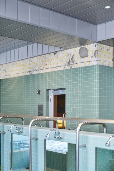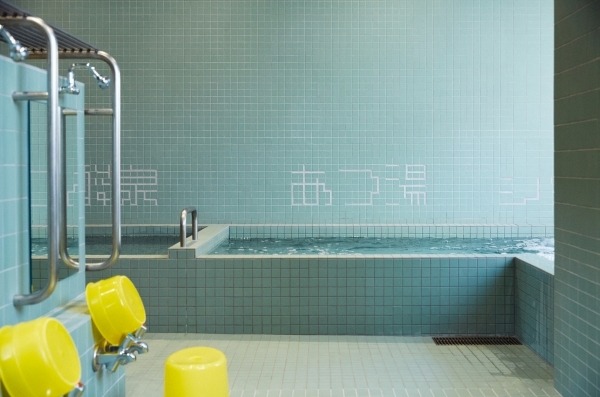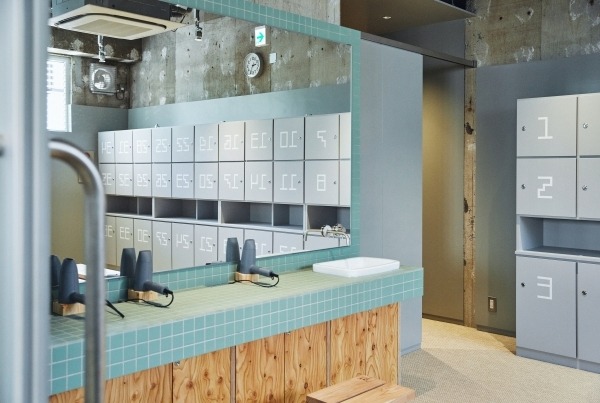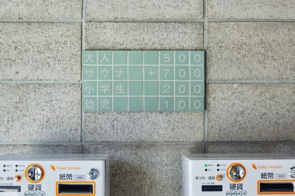 タイルの文脈は、館内全体に広がる。ロッカーの番号、浴室内の「水風呂」「あつ湯」「炭酸泉」「ジェット」の文字、トイレのサインに至るまで、すべて同じ思想でデザインされている。空間全体に一貫性がある。