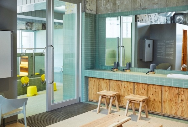 ロッカー前のベンチや洗面台のスツールには、石巻工房のプロダクトが使われている。どれも過度な装飾はなく、素材感と構造がそのまま表に出ているものだ。削ぎ落とされたプロダクトと余白のある建築の関係によって、空間全体に過剰な主張が生まれない。
